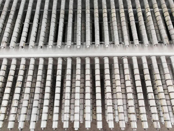 該篩板的(de)高頻音叉條,在隨篩(shāi)板振動(dòng)的同時,產生二次(cì)高頻諧振,使物料(liào)前進(jìn)速度加快,加速了篩(shāi)麵上顆粒物料(liào)的下沉和(hé)已接觸篩麵的小(xiǎo)顆粒物料(liào)向(xiàng)篩孔處橫移的速度,從而增加了通過篩孔的概率(lǜ),該篩板的(de)開孔**高可(kě)達80%,有一定水分的粘物,靠其高頻自振抖落(luò),不易粘結在篩條造成堵塞(sāi),是粘性或含有纖維(wéi)物的難篩物料**為理想的篩板。